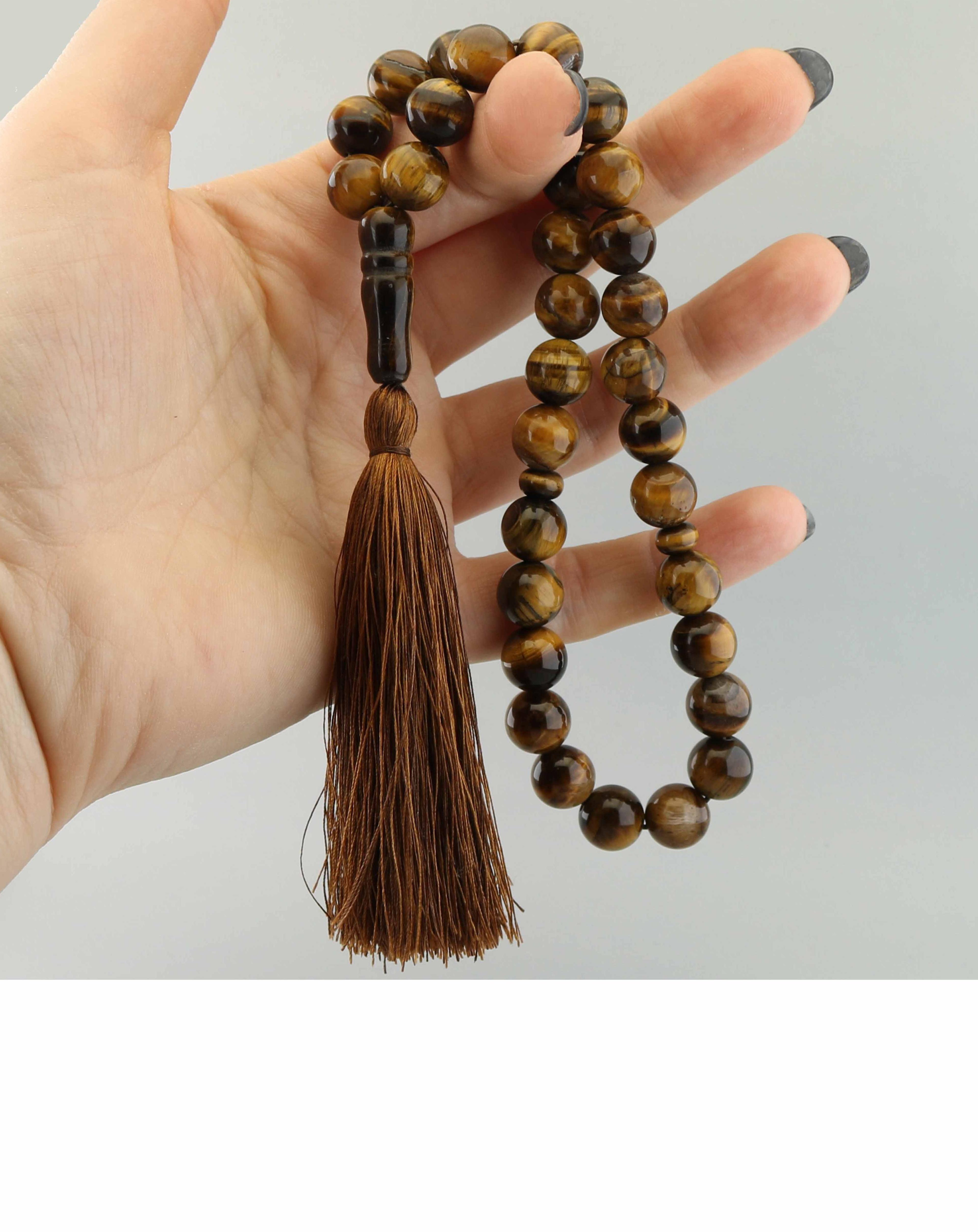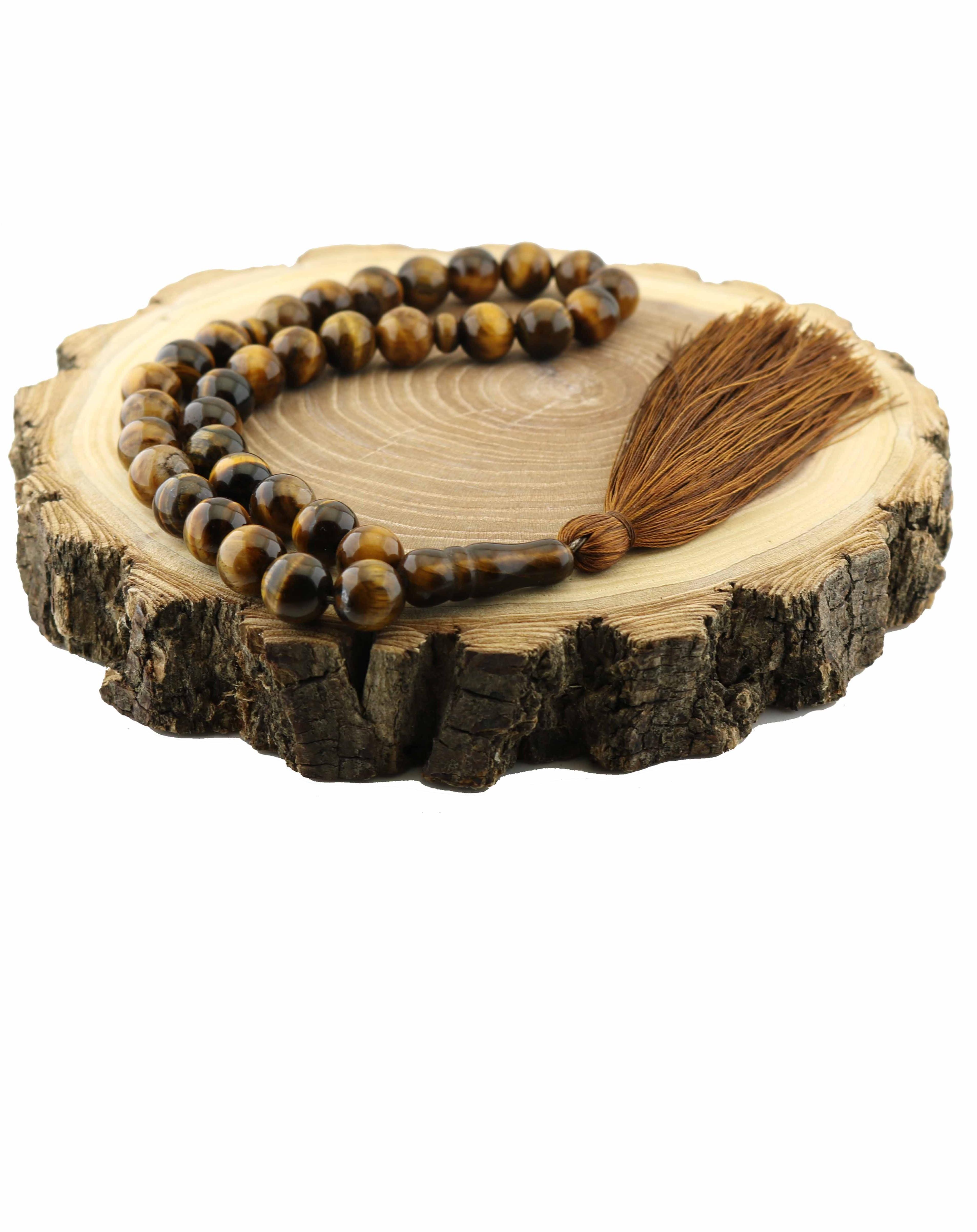 Тигровый глаз образуется при выветривании соколиного глаза. Камень из синего становится желто-коричневым. Структура камня и эффект кошачьего глаза остаются. На тигровом глазе эффект кошачьего глаза выглядит как желтая полоска. Эти полоски двигаются по поверхности бусины при перемещении угла зрения или источника света. В некоторых восточных странах считается, что перебирая четки с эффектом кошачьего глаза можно уменьшить нервное напряжение. Раньше так даже пытались лечить нервные болезни.