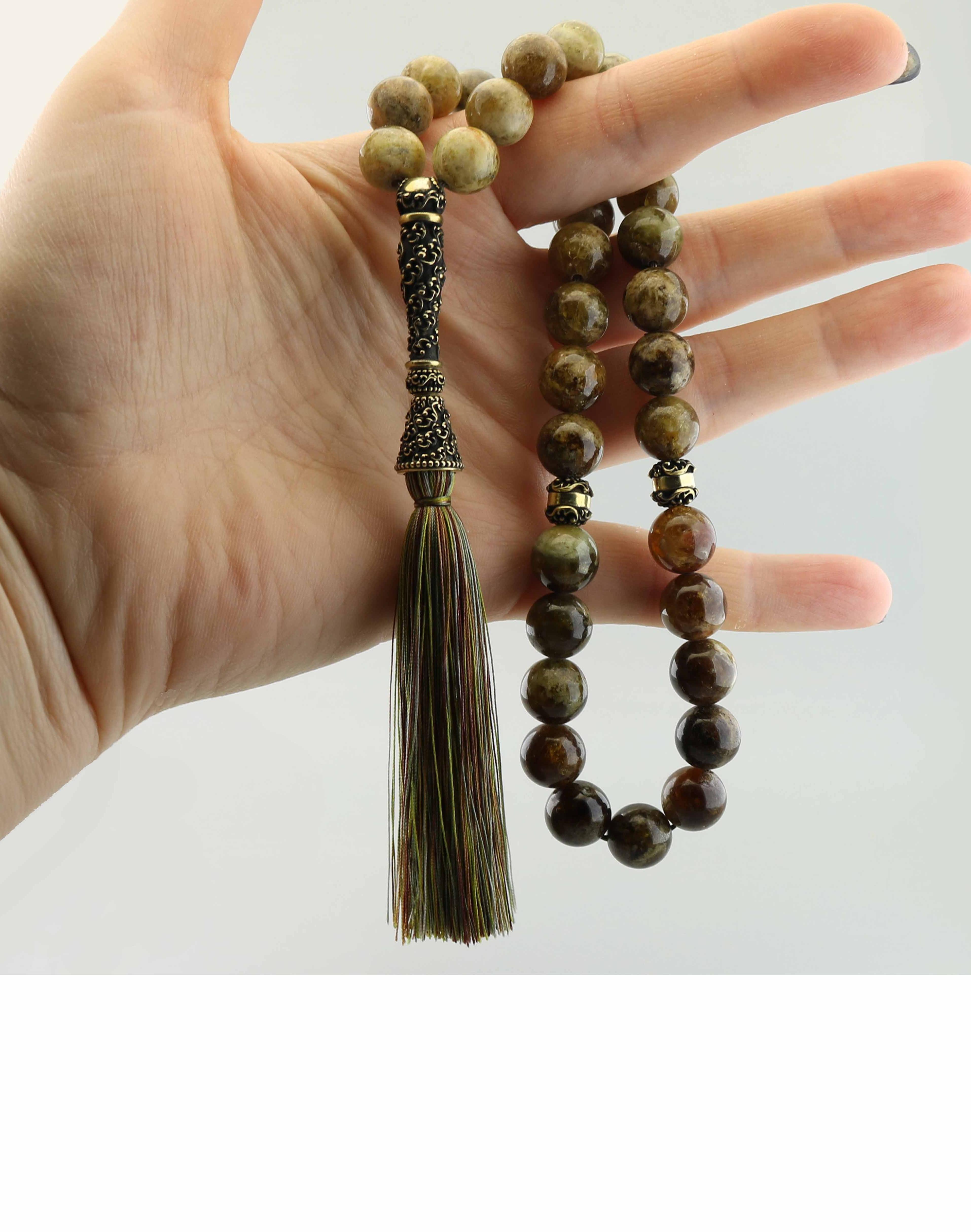 Многие считают, что гранат- камень красного цвета. Но это не всегда так. В группе гранатов очень много минералов. И целых три из них - зеленые: демантоид, гроссуляр и уваровит. В этих четках в основном используется желто-зеленый демантоид с коричневатыми вrлючениями. Все гранаты - камни тяжелые. И, несмотря на сравнительно небольшой размер бусин - 10 мм, четки весят больше 12ти миллиметровых агатовых. Бусины в этих четках подобраны по цвету чтобы образовывать цветовую растяжку от светлого бежевато-салатного до темного, болотно-зеленого. Кисть из натурального шелка тоже разноцветная. Нитки подобраны под цвет камня. Весь металл в четках - серебро 925 пробы. Серебряные детали изготовлены на заказ по моим эскизам специально для четок. Бусины нанизаны на прочный плетеный полимерный шнур в 4 сложения, дополнительно натертый натуральным воском. Края отверстий бусин обработаны, чтобы не перетирать нить. Но, если четки все же порвутся, я их починю бесплатно, сколько бы времени ни прошло. Четки упакованы в коробочку с логотипом и описанием и конвертик из микрофибры.